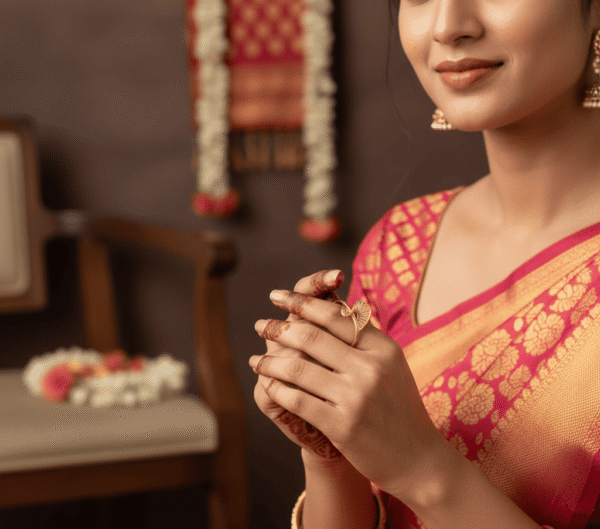 Nature-inspired elegance meets sculptural finesse in yellow gold Ring with a finely ridged leaf design flowing into a smooth open band.This Ring pairs effortlessly with festive silks or soft pastels where the leaf’s golden glide adds a natural rhythm that elevates your look with a touch of artistic ease.