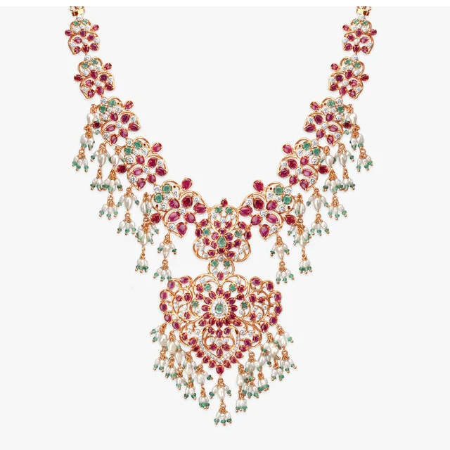 The Regal Bloom Diamond Necklace is a masterpiece of opulence, crafted in 18 Karat rose gold. This statement piece features an intricate floral arrangement of lush rubies and rich emeralds, accentuated by natural diamonds that enhance its regal charm. Cascading pearls add a finishing touch, lending a sense of movement and grace. Designed for those who appreciate grandeur, this necklace set is perfect for momentous occasions, exuding sophistication and timeless allure.