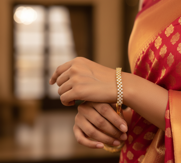 Sparkling Essential Golden Prism Bracelet – an exquisite piece that embodies grace, elegance, and modern sophistication. Crafted from premium brass and luxuriously plated in radiant yellow gold, this bracelet is a statement of timeless beauty. Its intricate prism-inspired design is accentuated with delicate floral motifs, adding a touch of refinement that seamlessly blends traditional charm with contemporary aesthetics. Perfect for parties, office wear, everyday elegance, and even vacation chic, this bracelet complements a variety of styles, from ethnic ensembles to Western fashion statements