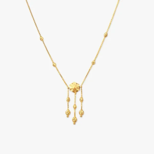 Sculpted and sleek, this yellow gold Necklace features a hexagon centre and cascading Chains dotted with carved gold spheres.Blend tradition with structure through this artistic Necklace. The central hexagon and gold tassels work beautifully with soft festive sarees or kurtis.